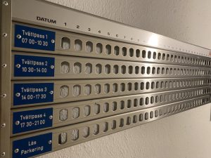 Nu är tvättstugan – liksom trapphus och hela källaren – uppfräschad och vi har skaffat ny tavla för markering/bokning.